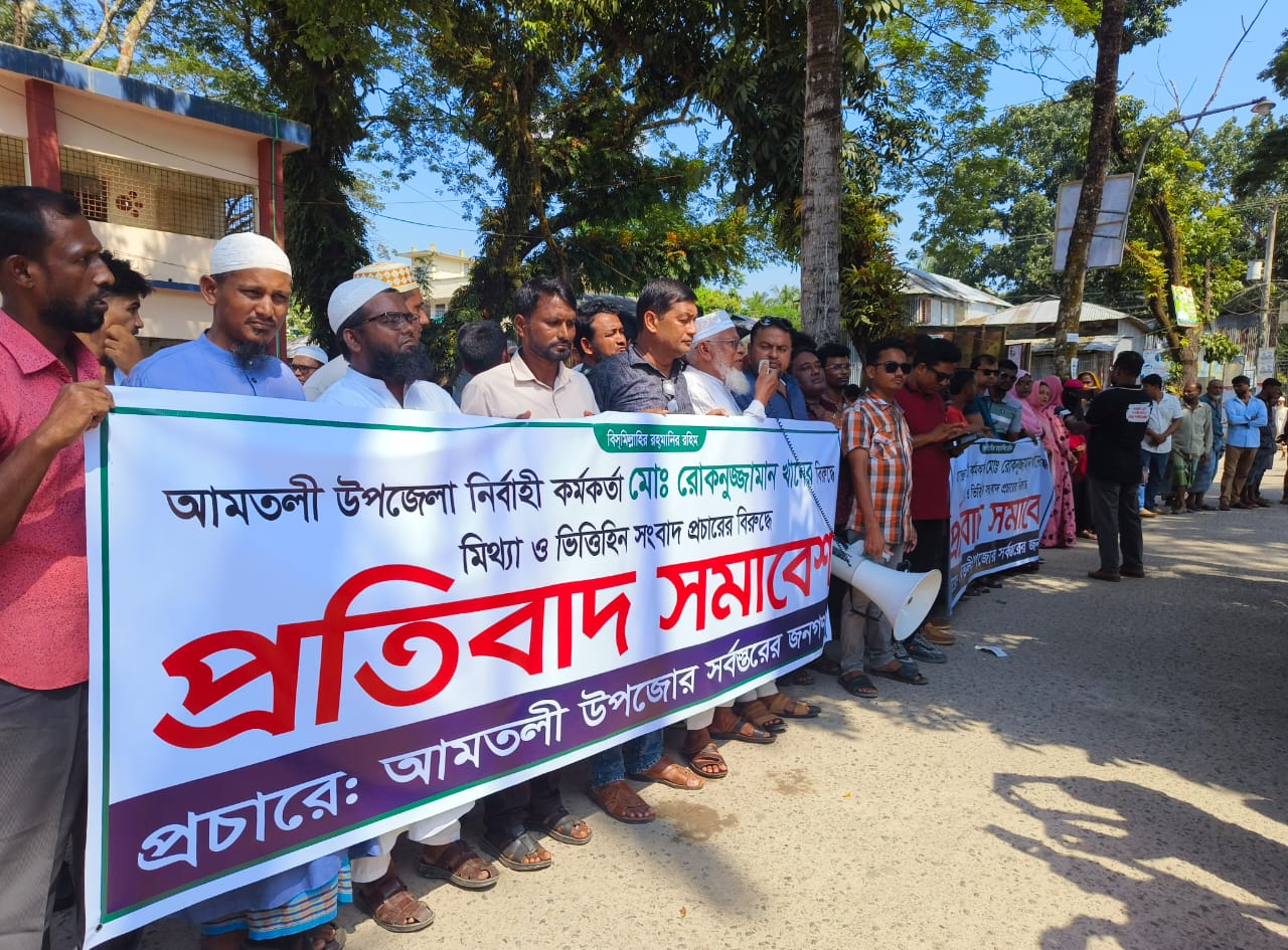আমতলীর ইউএনও ও পৌর প্রশাসক মো. রোকনুজ্জামান খান এর বিরুদ্ধে মিথ্যা এবং বানোয়াট তথ্য দিয়ে সামাজিক যোগাযোগ মাধ্যম এবং বিভিন্ন অনলাইন পোর্টালে নিউজ প্রকাশ করার প্রতিবাদে এবং অপপ্রচারকারীদের বিচারের দাবীতে বৃহস্পতিবার সকালে উপজেলা পরিষদের সামনে মানববন্ধন কর্মসূচী পালন ও প্রতিবাদ সমাবেশ করেছে শত শত মানুষ। উপজেলা বিএনপি এ সমাবেশ ও মানবন্ধন কর্মসূচীর আয়োজন করে।