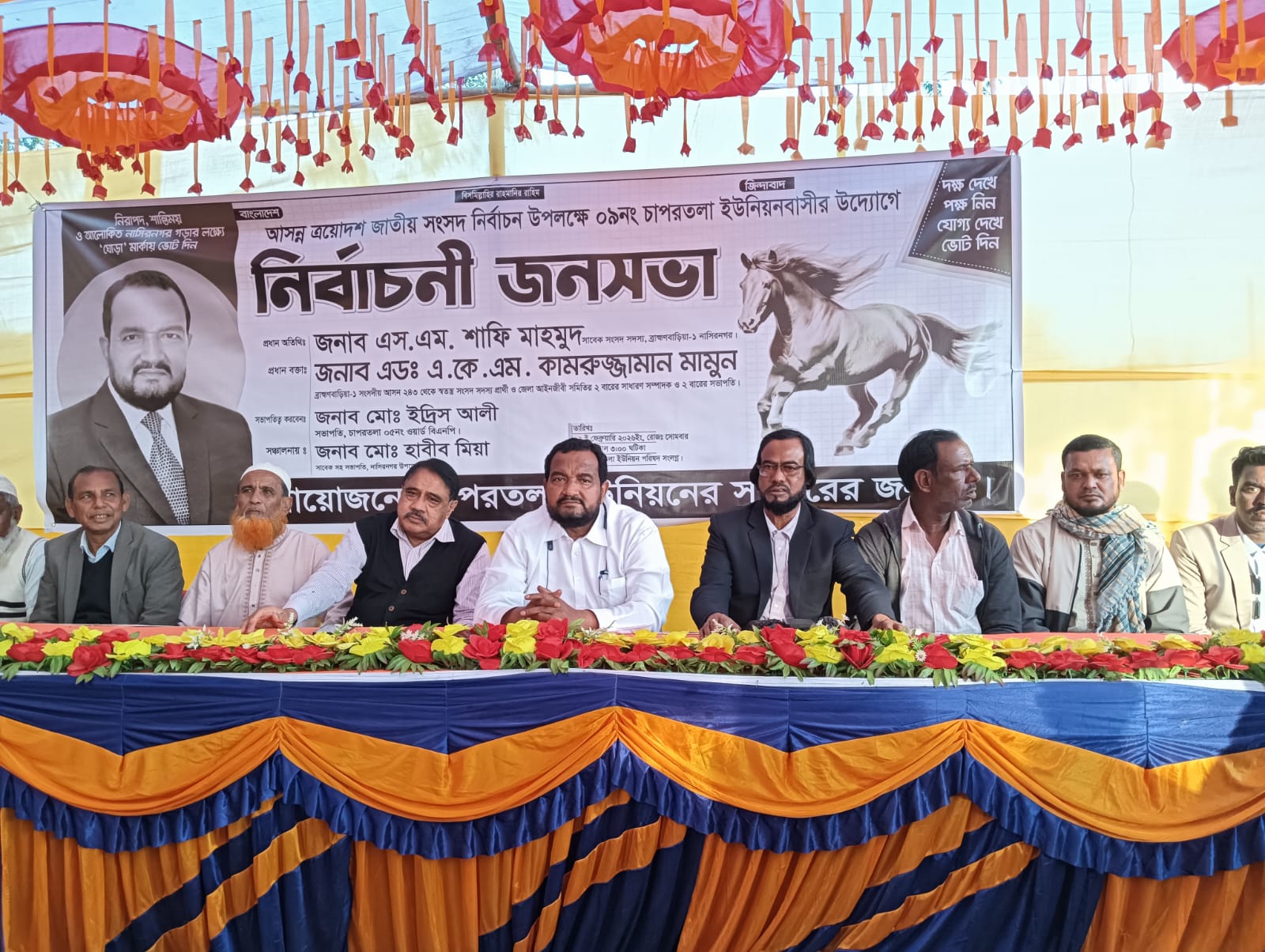 চাপরতলা ইউনিয়ন ৫নং ওয়ার্ড বিএনপির সভাপতি মোঃ ইদ্রিস আলীর সভাপতিত্বে ও উপজেলা জাসাসের সাবেক সহ- সভাপতি মোঃ হাবিব মিয়ার সঞ্চালনায় প্রধান অতিথি হিসেবর উপস্থিত ছিলেন ব্রাহ্মণবাড়ীয়া-১ নাসির নগর আসনে সাবেক সংসদ সদস্য (এমপি) ভাটি অঞ্চলের কিংবদন্তি রাজনীতিবীদ মাটি ও মানুষের জননন্দীত নেতা এস এম শাফি মাহমুদ। প্রধান বক্তা হিসেবে উপস্থিত থেকে বক্তব্য রাখেন ব্রাহ্মণবাড়ীয়া -১ নাসির নগর সংসদীয় ২৪৩ আসনে স্বতন্ত্র সংসদ সদস্য পদপ্রার্থী জেলা বিএনপির সাবেক সহ- সভাপতি, জেলা আইনজীবী সমিতির ২ বারের সাধারণ সম্পাদক ও ২ বারের সভাপতি ও তিন বারের সাবেক ইউনিয়ন পরিষদের চেয়ারম্যান এডভোকেট এ কে এম কামরুজ্জামান মামুন, অন্যান্যদের