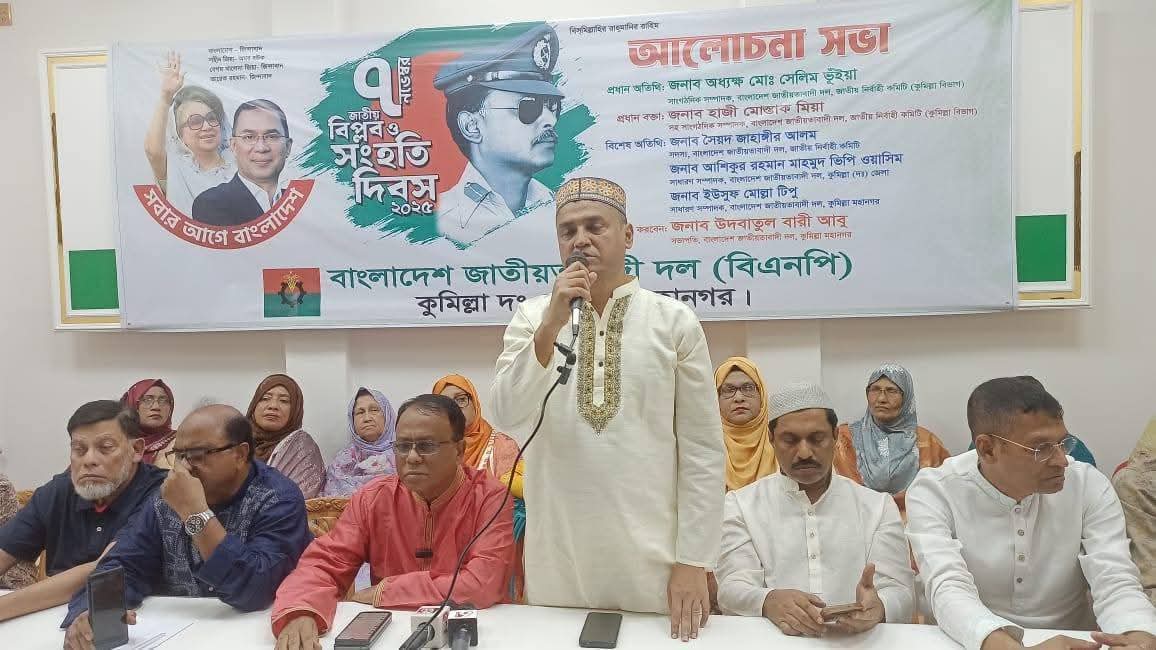 আজ ঐতিহাসিক ০৭ নভেম্বর জাতীয় বিপ্লব ও সংহতি দিবস উপলক্ষে কুমিল্লা নগরীর কান্দিরপাড়স্থ দলীয় কার্যালয়ে আয়োজিত হয়। উক্ত অনুষ্ঠানের আলোচনা সভায় প্রধান অতিথি হিসেবে উপস্থিত ছিলেন অধ্যক্ষ সেলিম ভূইয়া, সাংগঠনিক সম্পাদক, বাংলাদেশ জাতীয়তাবাদী দল (বিএনপি), প্রধান বক্তা হিসেবে উপস্থিত ছিলেন হাজী মোস্তাক মিয়া, সহ-সাংগঠনিক সম্পাদক (কুমিল্লা বিভাগ), জাতীয় নির্বাহী কমিটি, বিএনপি।