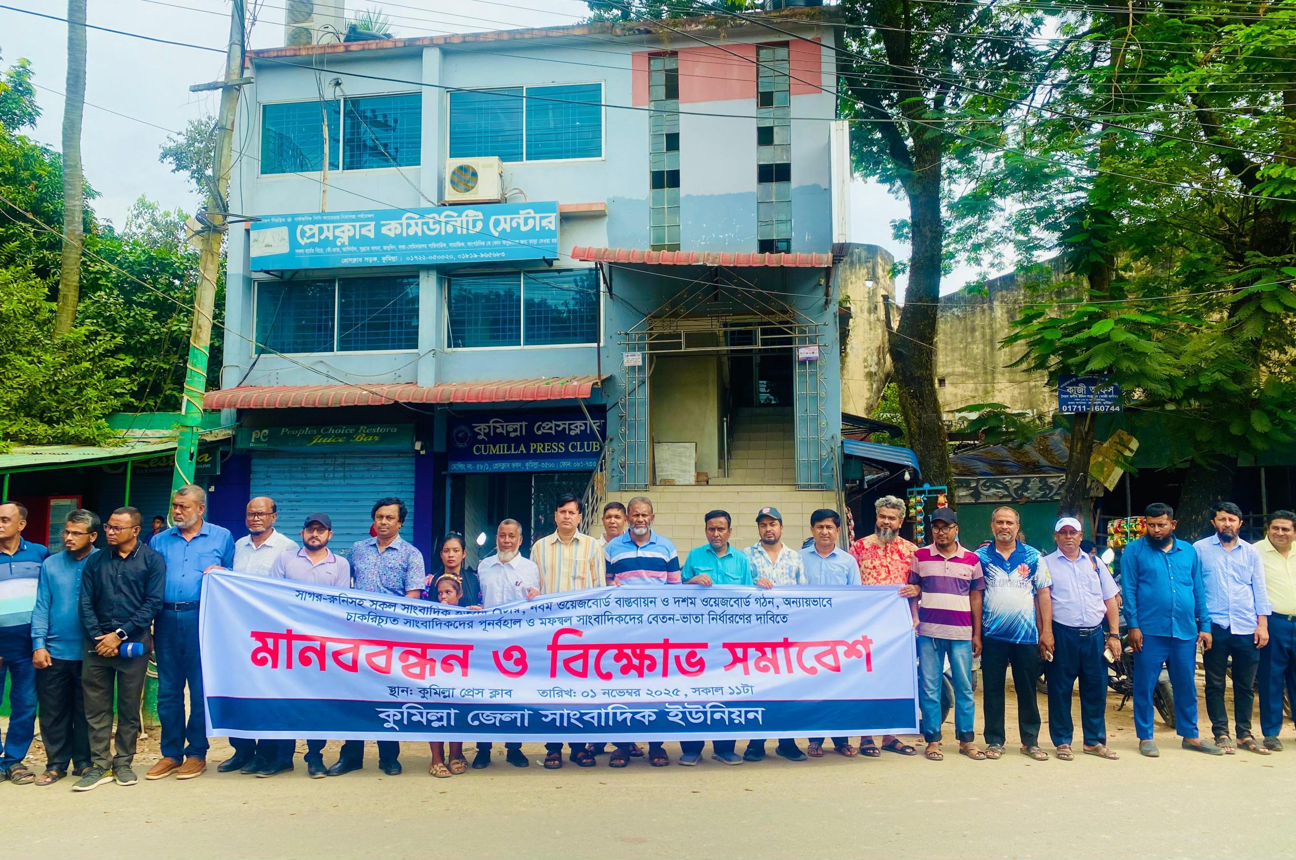 সাংবাদিক দম্পতি সাগর সরোয়ার ও মেহেরুন রুনিসহ সকল সাংবাদিক হত্যার বিচার, নবম ওয়েজবোর্ড বাস্তবায়ন ও দশম ওয়েজবোর্ড গঠনসহ ২১ দফা দাবিতে কুমিল্লায় মানববন্ধন ও বিক্ষোভ সমাবেশ অনুষ্ঠিত হয়েছে। কুমিল্লা জেলা সাংবাদিক ইউনিয়নের উদ্যোগে শনিবার দুপুরে কুমিল্লা প্রেস ক্লাবের সামনে এ কর্মসূচি পালন করা হয়।