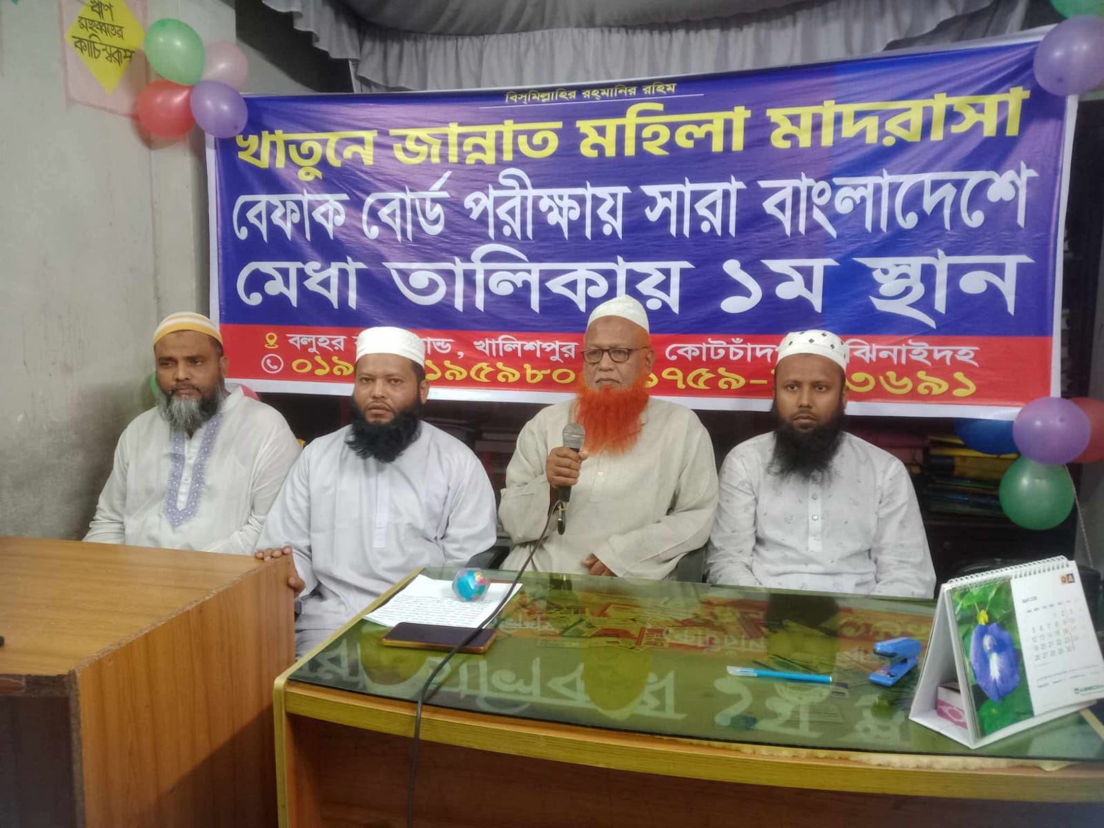 ঝিনাইদহের কোটচাঁদপুরে সৃষ্টি হলো এক অনন্য ইতিহাস। বেফাকুল মাদারিসিল আরাবিয়া বাংলাদেশ (বেফাক) বোর্ডের অধীনে অনুষ্ঠিত কেন্দ্রীয় পরীক্ষায় হেফজুল কুরআন বিভাগে সারা বাংলাদেশের মেধা তালিকায় প্রথম স্থান অধিকার করে দেশসেরা হওয়ার গৌরব অর্জন করেছেন হাফেজা মোছাঃ সাদিয়া খাতুন। এই অভাবনীয় সাফল্য উদযাপনে কোটচাঁদপুরের খাতুনে জান্নাত মহিলা মাদরাসার তিন কৃতি শিক্ষার্থীকে দেওয়া হয়েছে রাজকীয় সংবর্ধনা।