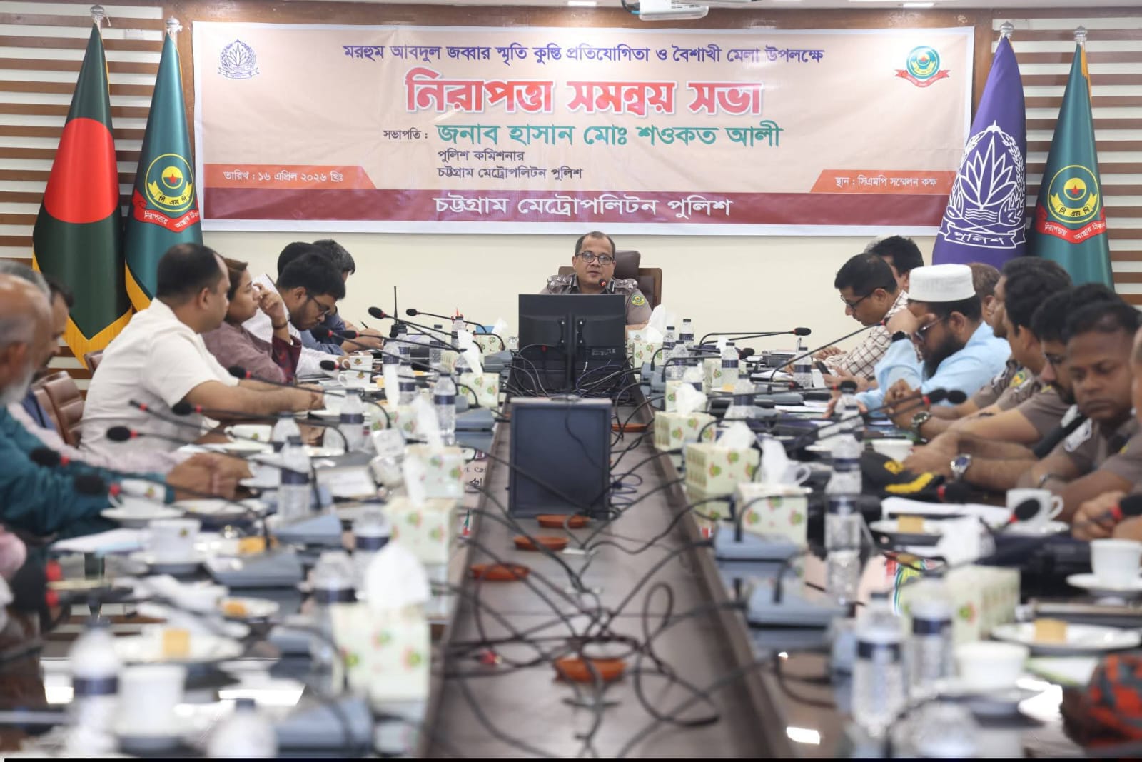 আসন্ন ঐতিহ্যবাহী মরহুম আবদুল জব্বার স্মৃতি কুস্তি প্রতিযোগিতা (বলি খেলা) ও বৈশাখি মেলা উপলক্ষে সার্বিক আইন-শৃঙ্খলা পরিস্থিতি নিশ্চিত করার লক্ষ্যে আজ ১৬ এপ্রিল ২০২৬ খ্রি. তারিখ সকাল ১১.০০ ঘটিকায় চট্টগ্রাম মেট্রোপলিটন পুলিশের (সিএমপি) হেডকোয়ার্টার সম্মেলন কক্ষে “নিরাপত্তা সমন্বয় সভা” অনুষ্ঠিত হয়। উক্ত সভায় সভাপতিত্ব করেন সিএমপি কমিশনার জনাব হাসান মোঃ শওকত আলী । সভায় বিভিন্ন সরকারি ও বেসরকারি সংস্থার প্রতিনিধি, সংশ্লিষ্ট স্টেকহোল্ডার এবং আইন-শৃঙ্খলা রক্ষাকারী বাহিনীর কর্মকর্তাগণ উপস্থিত ছিলেন।