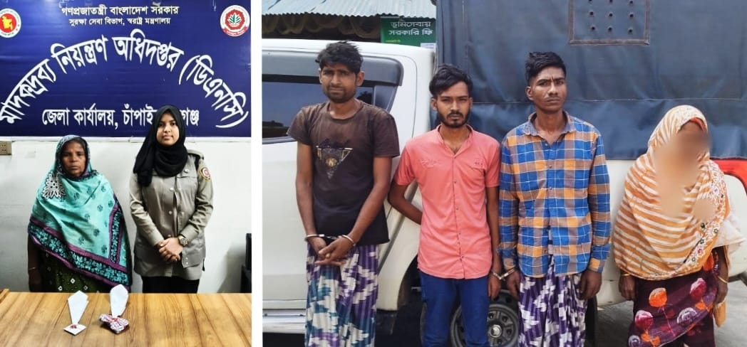 কানসাট বাজারের মোঃ রবুর ছেলে মোঃ সুহেল (৩৪), কানসাট বাজারের মোঃ রবুর ছেলে মোঃ মুরুজ আলী (২৬), পিরোজপুর গ্রামের মৃত হানিফ মন্ডলের মেয়ে মোসা: ইরিনা বেগম (২০)। সকলের থানা: শিবগঞ্জ, জেলা: চাঁপাইনবাবগঞ্জ। অভিযানে তাদের কাছ থেকে সর্বমোট ৫২ গ্রাম গাঁজা উদ্ধার করা হয়। পৃথকভাবে উদ্ধারকৃত আলামত হিসেবে ৫২ গ্রাম গাঁজা উদ্ধার করেন । অপরদিকে, চাঁপাইনবাবগঞ্জ জেলার শিবগঞ্জ থানাধীন কানসাট শিকারপুর গ্রামস্থ এলাকা।