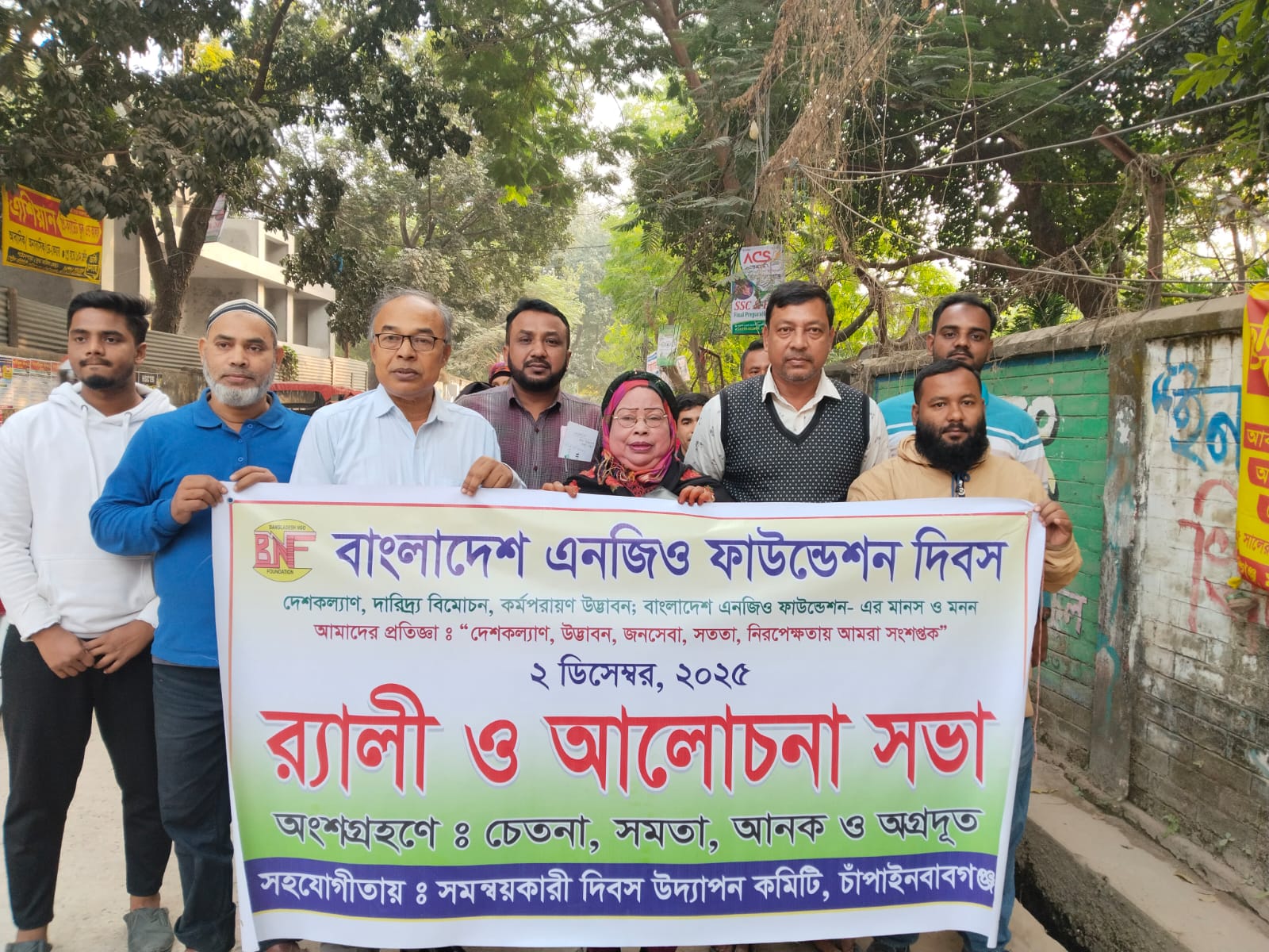 চাঁপাইনবাবগঞ্জ জেলায় পালিত হলো 'বাংলাদেশ এনজিও ফাউন্ডেশন ' দিবস। দিবসটি পালন উপলক্ষে ২ ডিসেম্বর বর্ণাঢ্য র্যালি ও আলোচনা সভার আয়োজন করা হয়। দিবস উদযাপনের আলোচক সংগঠক চেতনা মানবিক উন্নয়ন সংস্থা ছাড়াও তিনটি বেসরকারি প্রতিষ্ঠান যথাক্রমে সমতা নারী উন্নয়ন সংস্থা, আহমদ নগর কমপ্লেক্স (আনক) ও অগ্রদূত বাংলাদেশ অংশগ্রহণ করে। চাঁপাইনবাবগঞ্জ জেলা সদরে কাঁঠাল বাগিচা গাবতলা মোড় হতে বর্ণাঢ্য র্যালি আরম্ভ হয়ে বিভিন্ন সড়ক প্রদক্ষিন করে।