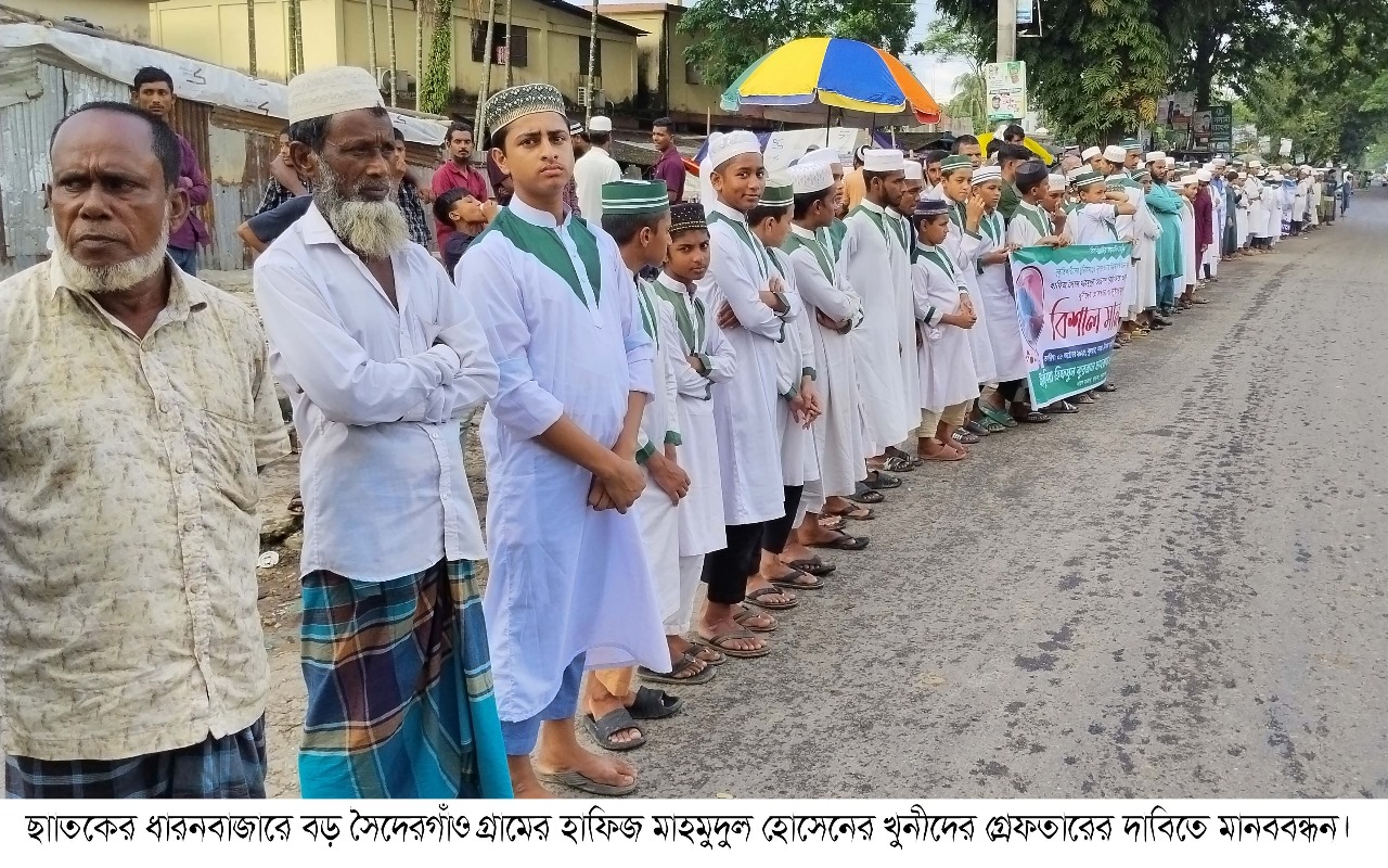 বক্তারা বলেন,কোন এক অদৃশ্য কারনে ২০২৪ সালের ৩ অক্টোবর সকাল ৮ টা ১০ মিনিট হতে সাড়ে ৮টার মধ্যে অঘ্যাতনামা দুস্কৃতিকারীরা হাফিজ সৈয়দ মাহমুদুল হোসেন(ওরফে আব্দুল হান্নান পীর রহ:) এর বসতঘরে ঢুকে দারালো ছুরি দিয়ে শরীরের বিভিন্নস্থানে আঘাত করে রক্তাক্ত জখম করে পালিয়ে যায়।ধারন বাজার ব্যবসায়ী কমিটির সাবেক সভাপতি পার্শবর্তী কাকুরা গ্রামের আলহাজ্ব শামসুল ইসলাম তার মেয়ে ও পুত্রবধু নিয়ে চিকিৎসা নিতে এসে দরজায় পড়ে থাকা হাফিজ সাহেবকে দেখে পাশে থাকা লোকজনকে ডাক দিলে তারা এসে এ অবস্হায় দেখে বাড়ীতে খবর দেন। খবর শুনে স্বজনরা এসে দ্রæত তাকে সিলেট এম এ জি ওসমানী মেডিকেল কলেজ হাসপাতালে নিয়ে গেলে চিকিৎসকরা তার মৃত্যু নিশ্চিত করেন। সকাল ৮.১০ মিনিট হতে সাড়ে আটটার ভিতরে অঞ্জাতনামা দুষ্কৃতকারীর চুরিকাঘাতে তিনি নিহত হন। পুলিশের সুরতহাল রিপোর্ট শেষে ঘটনার পরদিন অর্থাৎ ২০২৪ সালের ৪ অক্টোবর রাতে নিহতের ভাতিজা সৈয়দ জুমেল হোসেন বাদি হয়ে দেওয়ানী মামলায় বিবাদী পক্ষের ৪ জনের নাম সন্দেহভাজন অবস্থায় উল্লেখ করে অঞ্জাতনামা ৪/৫ জনকে আসামী করে ছাতক থানায় একটি হত্যা মামলা দায়ের করেন। কিন্ত নিহতের ঘটনায় মামলা দায়েরের একবছর পেরিয়ে গেলে ও কোন অপশক্তির থাবার কারনে পুলিশ এখন পর্যন্ত কোন আসামী সনাক্ত ও গ্রেফতার করতে না পারায় পুলিশের ভূমিকা নিয়ে প্রশ্ন তুলেন মানববন্ধনের বক্তারা। মামলাটি বর্তমানে সিআইডি সুনামগঞ্জের তদন্তাধীন আছে।