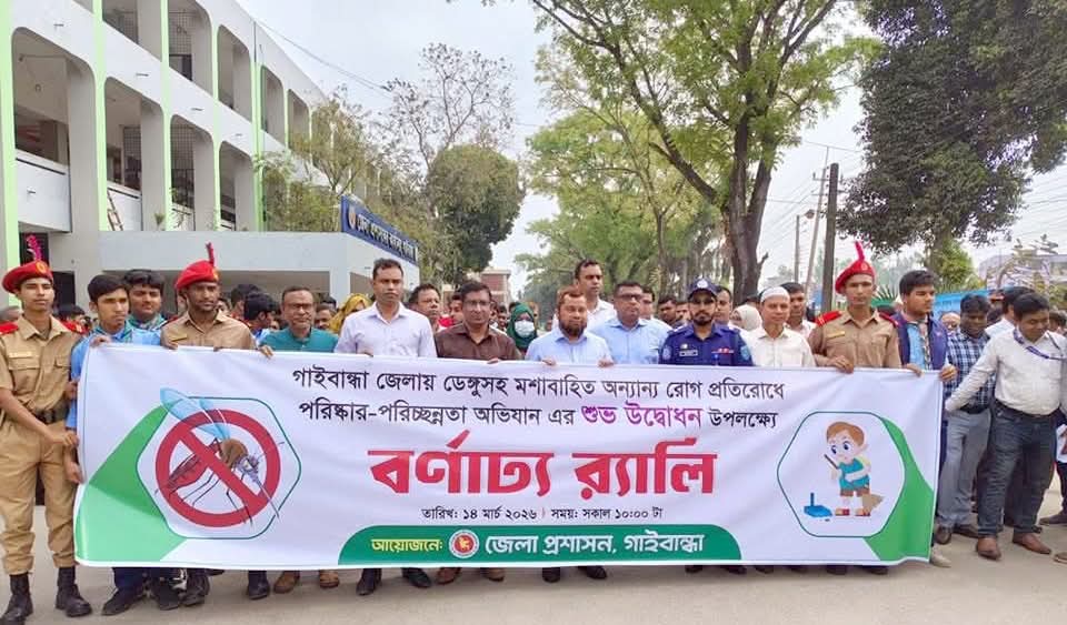 ডেঙ্গুসহ মশাবাহিত অন্যান্য রোগ প্রতিরোধে গাইবান্ধায় পরিষ্কার-পরিচ্ছন্নতা অভিযান শুরু হয়েছে। শনিবার (১৪ মার্চ) সকালে জেলা প্রশাসনের উদ্যোগে এই কর্মসূচির উদ্বোধন করেন জেলা প্রশাসক মাসুদুর রহমান মোল্লা।