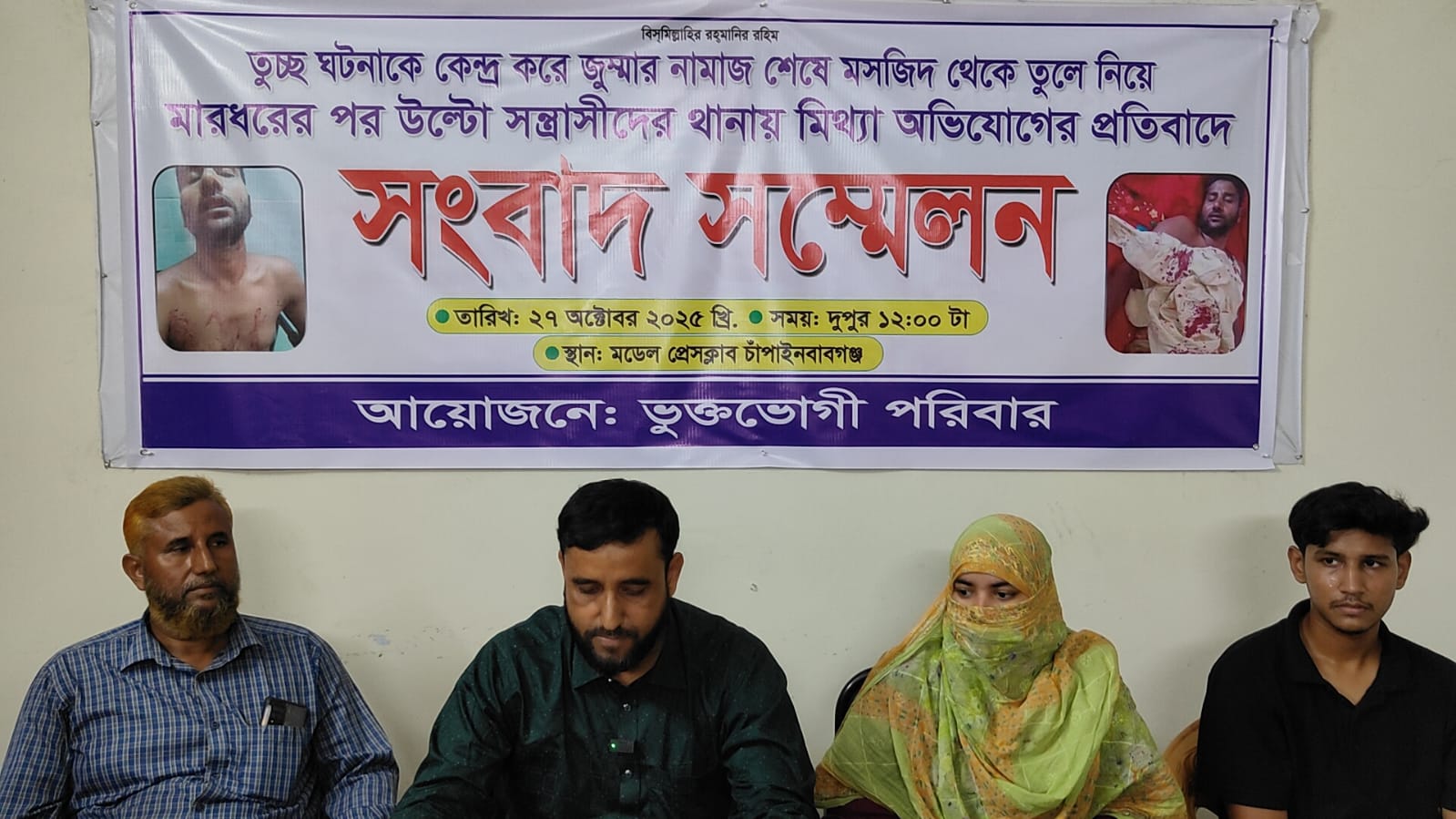 তুচ্ছ ঘটনাকে কেন্দ্র করে জুম্মার নামাজ শেষে মসজিদ থেকে তুলে নিয়ে মারধরের পর উল্টো সন্ত্রাসীদের থানায় মিথ্যা অভিযোগের প্রতিবাদে সংবাদ সম্মেলন
