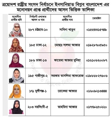 তিনি বলেন, অন্যান্য রাজনৈতিক সংগঠনের তুলনায় ইনসানিয়াত বিপ্লব নারীদের সর্বোচ্চ গুরুত্ব দিয়ে মোট ছয়টি সংসদীয় আসনে নারী প্রার্থী মনোনয়ন দিয়েছে। আসন্ন নির্বাচনে ইনসানিয়াত বিপ্লবের নারী প্রার্থীরা হলেন—