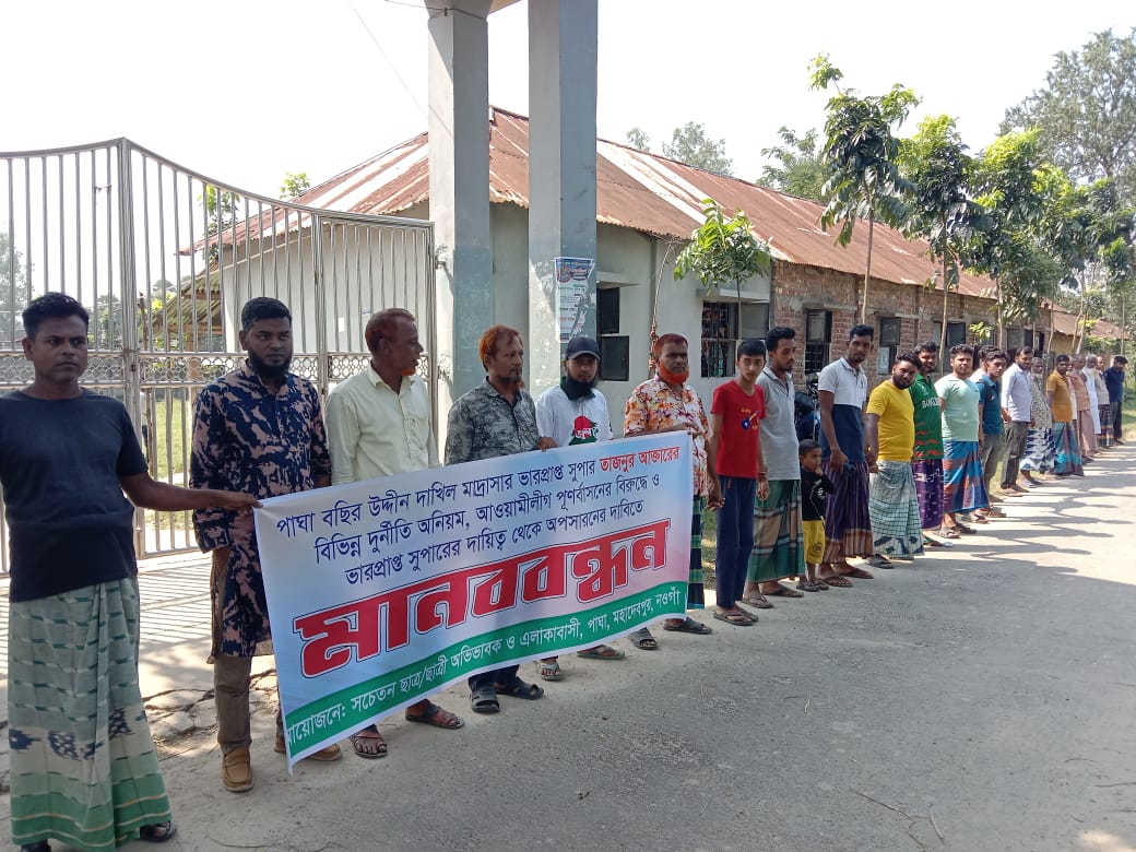 নওগাঁর মহাদেবপুর উপজেলার পাঘা বছির উদ্দীন দাখিল মাদ্রাসার ভারপ্রাপ্ত সুপার তাজনুর আক্তারের অপসারণের দাবিতে মানববন্ধন ও বিক্ষোভ সমাবেশ অনুষ্ঠিত হয়েছে।