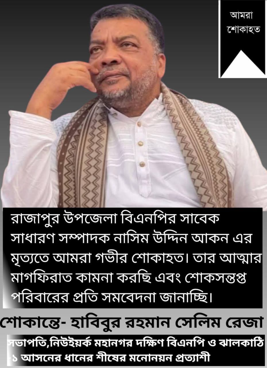রাজাপুর উপজেলা বিএনপির সাবেক সাধারণ সম্পাদক নাসিম উদ্দিন আকনের মৃত্যুতে গভীর শোক প্রকাশ করেছে নিউইয়র্ক মহানগর দক্ষিণ বিএনপি সভাপতি ও ঝালকাঠি-১ আসনের ধানের শীষের মনোনয়ন প্রত্যাশী হাবিবুর রহমান সেলিম রেজা। বর্তমানে তিনি দেশের বাহিরে অবস্থান করায় জানাজায় অংশ নিতে পারেননি।