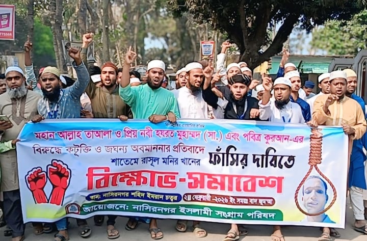 নাস্তিক মাইকেল মনির খানের ফাঁসীর দাবীতে নাসিরনগরে বিশাল বিক্ষোভ মিছিল ও সমাবেশ অনুষ্ঠিত,