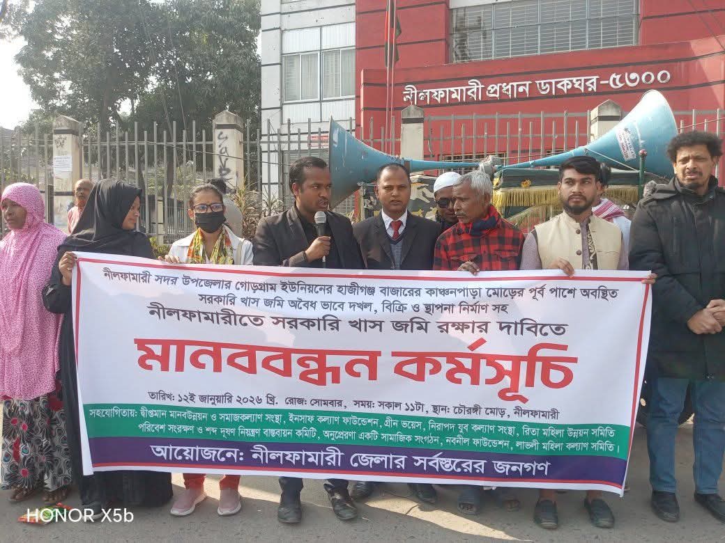 নীলফামারীতে অবৈধ দখলদারের বিরুদ্ধে মানববন্ধন,গণস্বাক্ষর ও স্মারকলিপি প্রদান