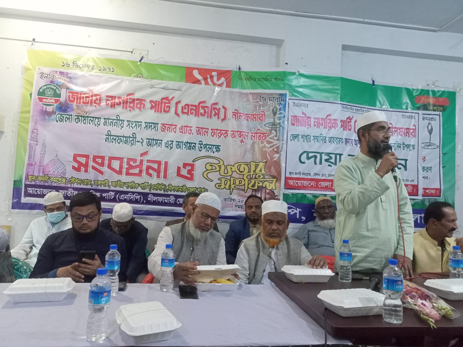 জাতীয় নাগরিক পার্টি (এনসিপি) নীলফামারী জেলা শাখার আয়োজনে নীলফামারী-২ (সদর) আসনের নবনির্বাচিত সংসদ সদস্য এডভোকেট আল ফারুক আব্দুল লতিফ-কে সংবর্ধনা ও ইফতার মাহফিল হয়।
