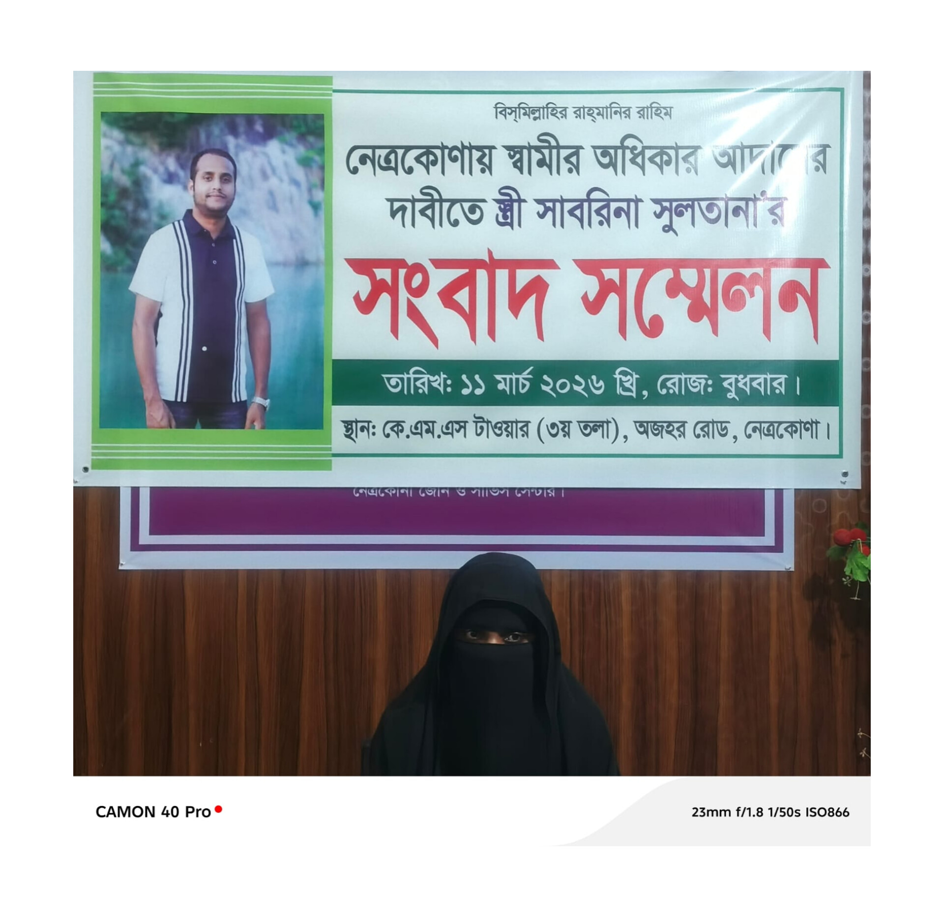 নেত্রকোনায় স্বামীর অধিকার আদায়ের দাবিতে সংবাদ সম্মেলন করেছেন সাবরিনা সুলতানা নামে এক নারী।