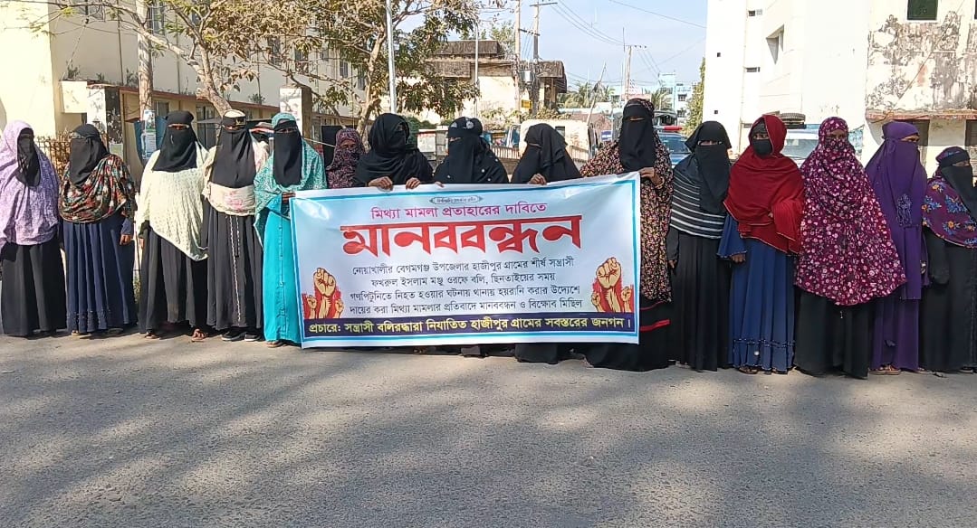 নোয়াখালীতে গনপিঠুনিতে বলি হত্যার মিথ্যা মামলা প্রত্যাহারের দাবীতে মানববন্ধন।