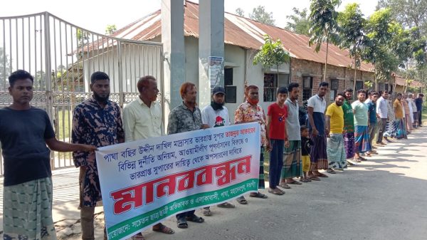 বুধবার সকাল (১৫ অক্টোবর) দশটা থেকে এগারটা পর্যন্ত জেলা শহরের কালিতলা বাসটার্মিনাল থেকে শুরু করে গাছবাড়ি পর্যন্ত প্রায় ৫কিলোমিটার রাস্তা জুরে এই মানবন্ধন অনুষ্ঠিত হয় জেলা জামায়াতে ইসলামীর ব্যানারে। শহরের চৌরঙ্গি মোড় পয়েন্টে জেলা জামায়াতের শীর্ষ নেতৃবৃন্দ অংশ নিয়ে বক্তব্য দেন।