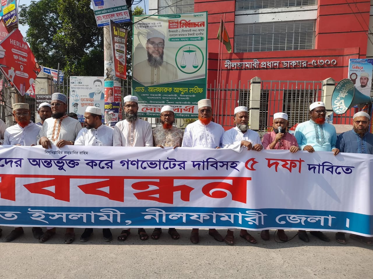আনুপাতিক প্রতিনিধিত্বমূলক (পিআর) পদ্ধতিতে আগামী জাতীয় সংসদ নির্বাচনের দাবীতে সারাদেশের কর্মসূচির অংশ হিসেবে নীলফামারীতেও মানববন্ধন করেছে বাংলাদেশ জামায়াতে ইসলামী।