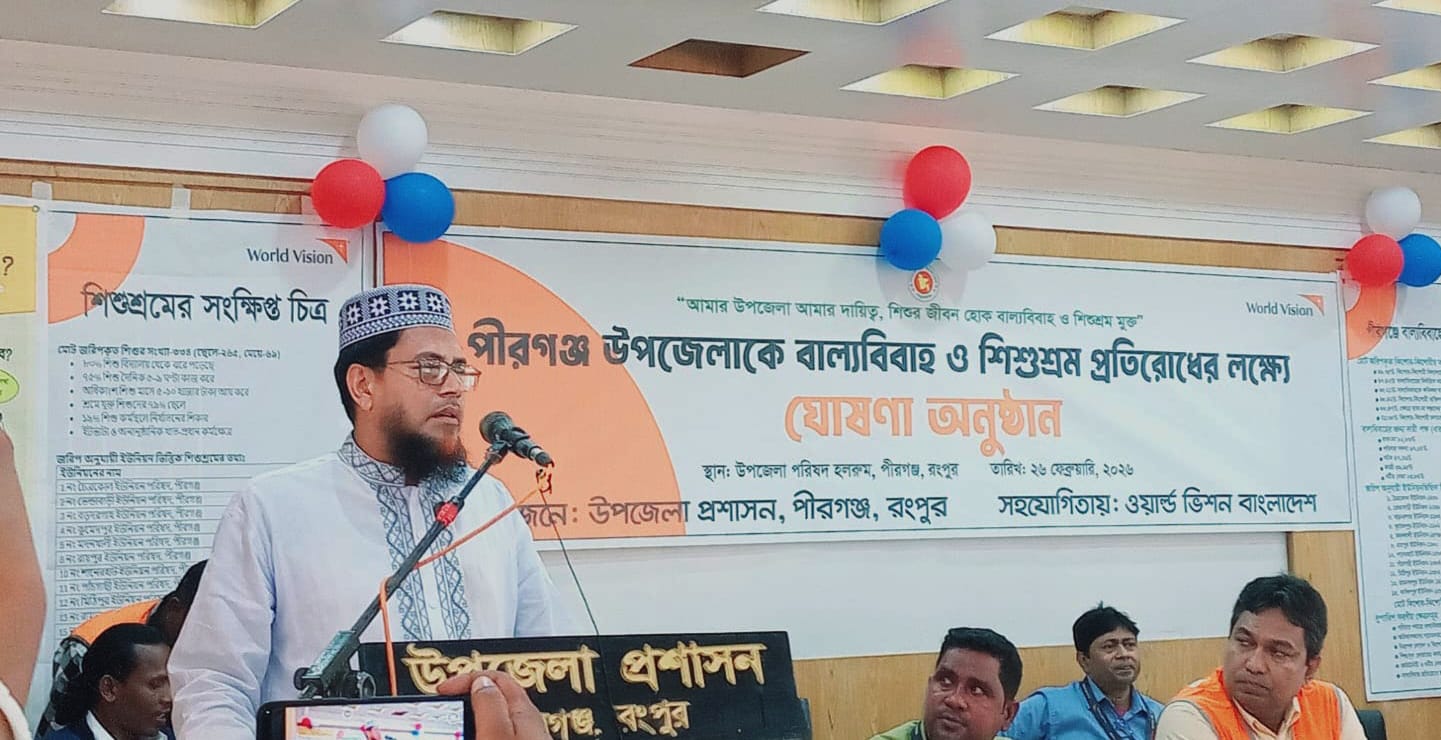 রংপুরের পীরগঞ্জ উপজেলাকে আনুষ্ঠানিকভাবে বাল্যবিবাহ ও শিশুশ্রম মুক্ত ঘোষণা করা হয়েছে। ২৬ ফেব্রুয়ারি ২০২৬ তারিখে উপজেলা পরিষদ হলরুমে আয়োজিত এক বর্ণাঢ্য অনুষ্ঠানের মাধ্যমে এই ঘোষণা দেওয়া হয়। পীরগঞ্জ উপজেলা প্রশাসনের আয়োজনে এবং আন্তর্জাতিক উন্নয়ন সংস্থা 'ওয়ার্ল্ড ভিশন বাংলাদেশ'-এর সহযোগিতায় এই ঐতিহাসিক মুহূর্তটি উদযাপিত হয়।