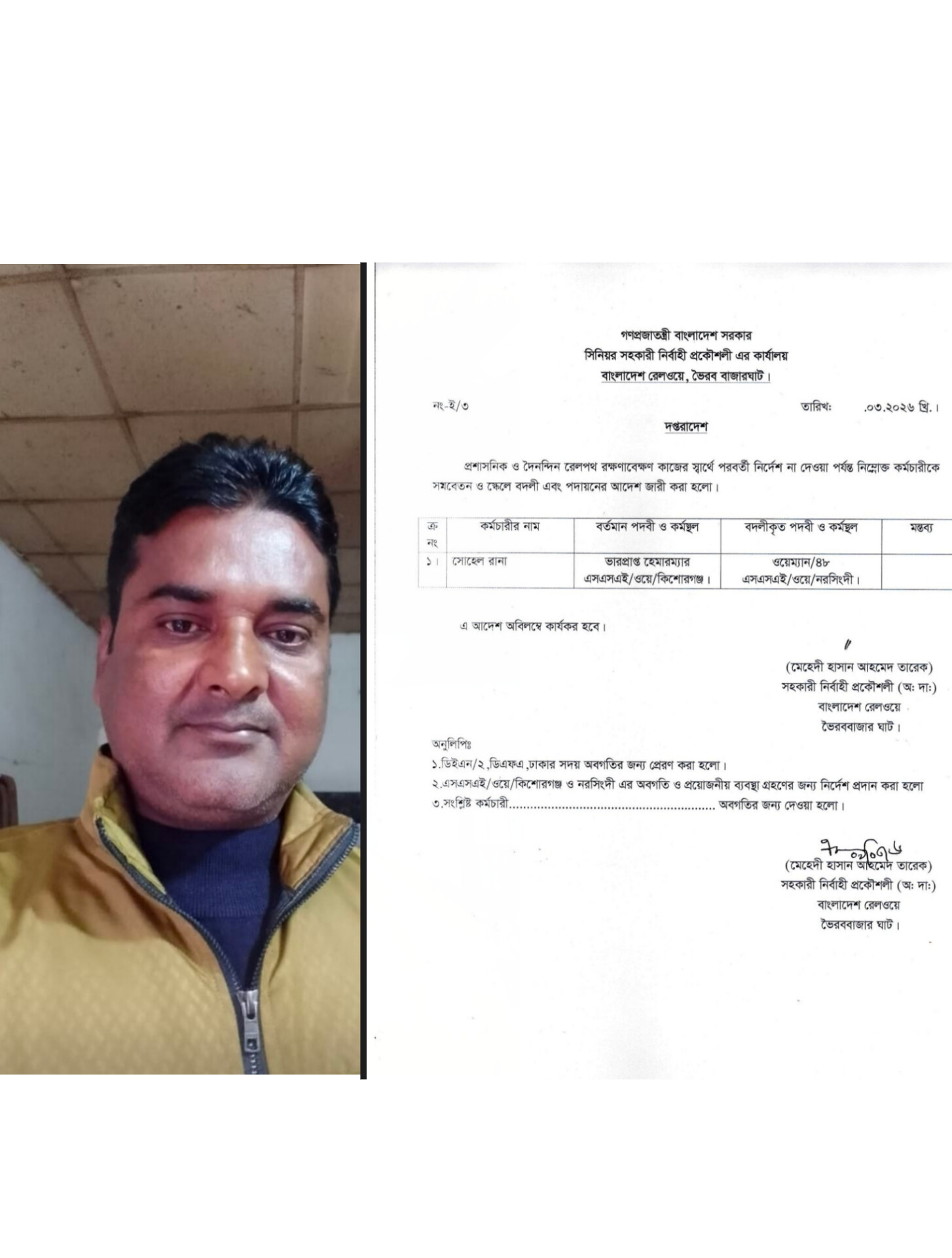 জানা গেছে, গত মার্চ মাসে ভৈরব বাজারঘাটে সিনিয়র সহকারী নির্বাহী প্রকৌশলীর কার্যালয় থেকে জারি করা এক দপ্তরাদেশে কিশোরগঞ্জ এসএসএই/ওয়ে অফিসে কর্মরত সোহেল রানাকে সমবেতন ও সমস্কেলে নরসিংদীতে বদলি ও পদায়নের নির্দেশ দেওয়া হয়। আদেশে স্পষ্টভাবে বলা হয়েছিল, নির্দেশটি অবিলম্বে কার্যকর করতে হবে এবং সংশ্লিষ্ট দপ্তরগুলোকে প্রয়োজনীয় ব্যবস্থা নিতে বলা হয়।