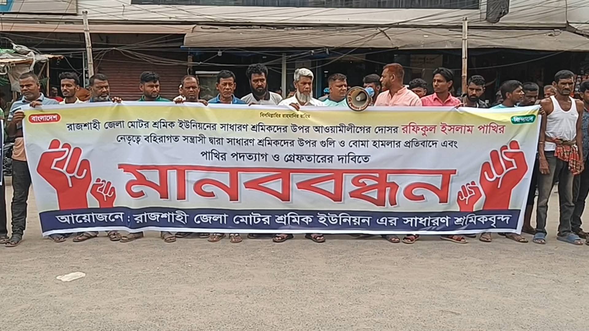 রাজশাহীতে মোটর শ্রমিকদের উপর হামলার প্রতিবাদে মানববন্দন
