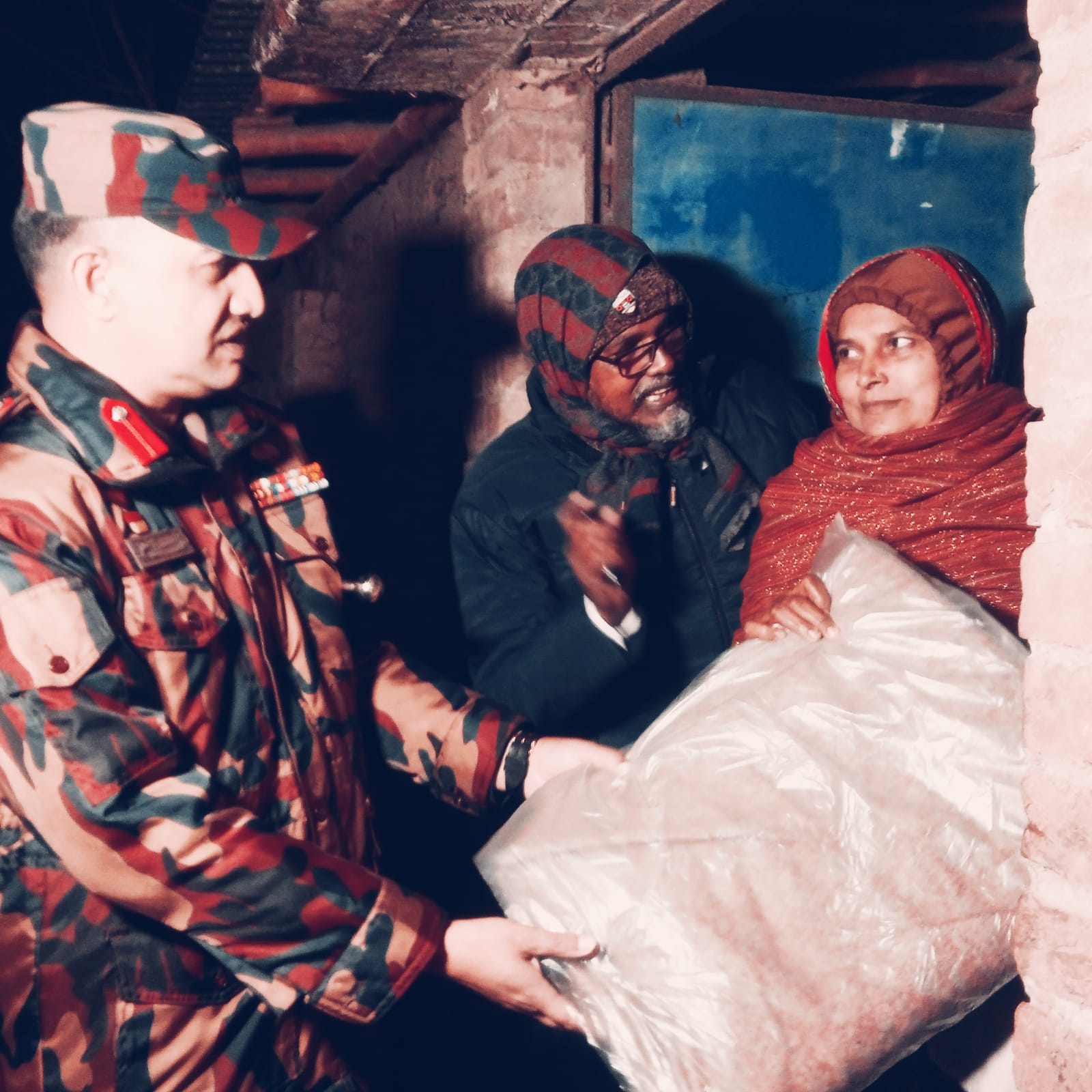 চাঁপাইনবাবগঞ্জে বিগত কয়েকদিন যাবৎ উত্তরবঙ্গের কয়েকটি জেলায় শীতের তীব্রতা আশঙ্কাজনকহারে বৃদ্ধি পায় এবং তাপমাত্রা ৮-৯ ডিগ্রিতে নেমে আসে। এতে সাধারণ জনগণ বিশেষ করে দুঃস্থ, ছিন্নমুল ও অসহায় ব্যক্তিবর্গ প্রচন্ড দুর্দশার মধ্যে পড়ে এবং তাদের স্বাভাবিক জীবনযাত্রা ব্যাহত হয়। সেই উপলব্ধি থেকেই গতকাল ১১ জানুয়ারি অধিনায়ক, মহানন্দা ব্যাটালিয়ন (৫৯ বিজিবি) নিজ উদ্যোগে লোক চক্ষুর অন্তরালে বিনা প্রচারণায় রাতের আঁধারে চাঁপাইনবাবগঞ্জ জেলাধীন শিবগঞ্জ উপজেলার দায়িত্বপূর্ণ সীমান্ত এলাকায় গমন করেন এবং শীতার্ত অসহায়