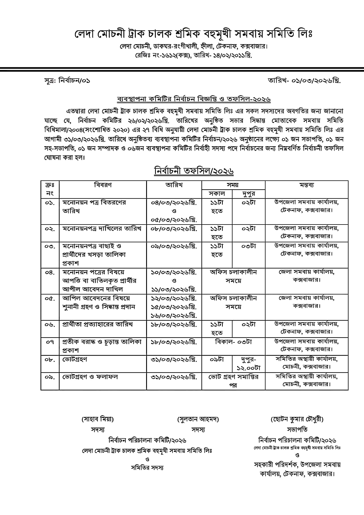 লেদা মোচনী ট্রাক চালক শ্রমিক বহুমুখী সমবায় সমিতির ব্যবস্থাপনা কমিটির নির্বাচন তফসিল ঘোষণা