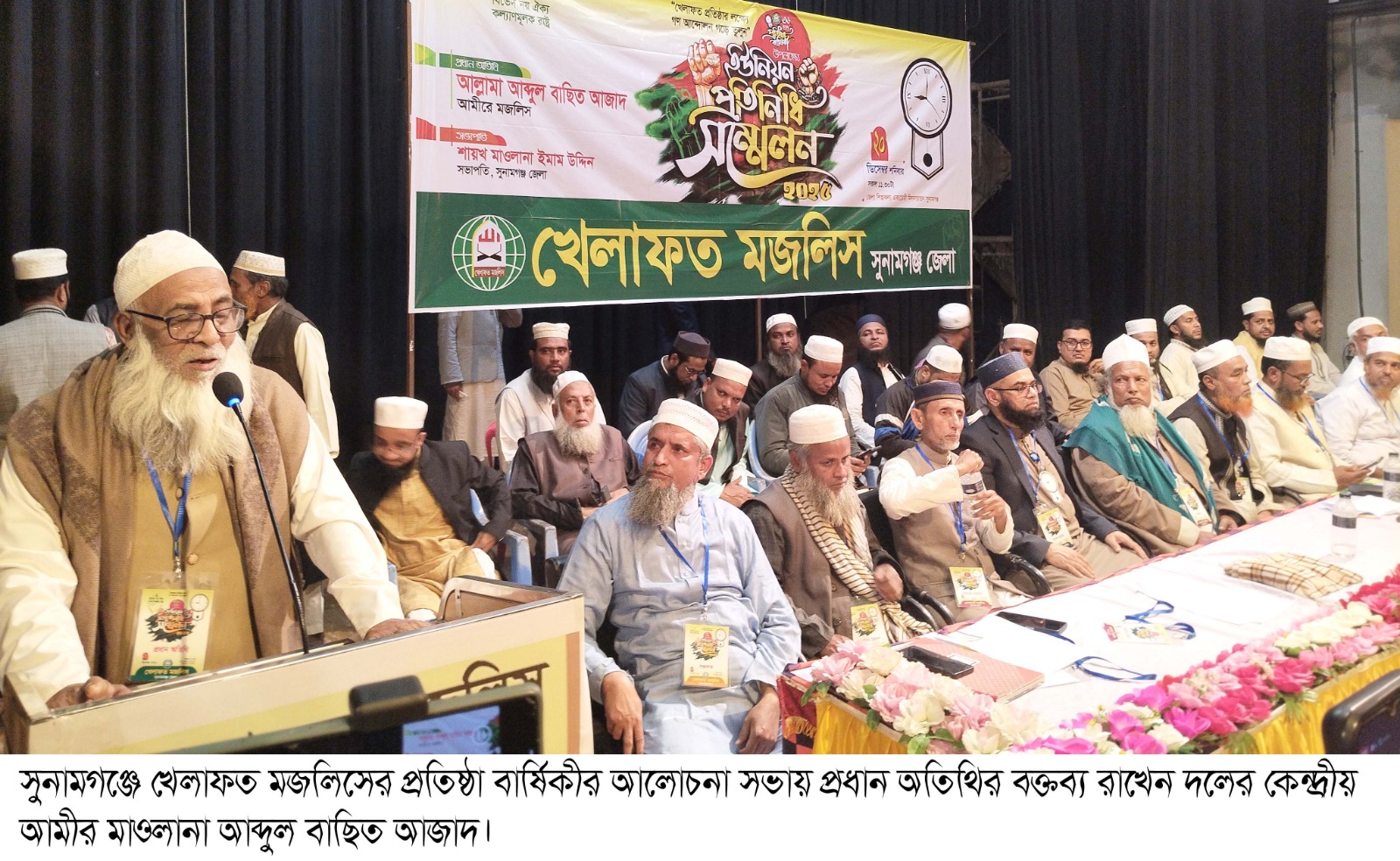 সুনামগঞ্জ জেলা খেলাফত মজলিসের সভাপতি মাওলানা শায়খ ইমাম উদ্দিনের সভাপতিত্বে ও সংগঠনের সাধারন সম্পাদক আক্তার হোসাইন ও সহ সাধারন সম্পাদক মাওলানা বোরহান উদ্দিনের যৗথ সঞ্চালনায় প্রতিষ্ঠা বার্ষিকীর আলোচনা সভায় প্রধান অতিথির বক্তব্যে রাখেন বাংলাদেশ খেলাফত মজলিসের আমীর আল্লামা আব্দুল বাছিত আজাদ ।