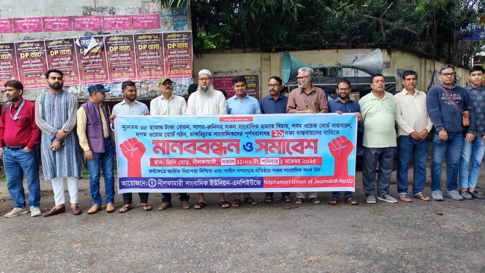 সাংবাদিকদের পেশাগত অধিকার নিশ্চিত করা এবং 'নো ওয়েজ বোর্ড নো মিডিয়া' নীতি কার্যকরের দাবিতে আজ শনিবার সকাল ১১টায় বাংলাদেশ ফেডারেল সাংবাদিক ইউনিয়নের (বিএফইউজে) কেন্দ্রীয় ঘোষিত কর্মসূচির অংশ হিসেবে নীলফামারীতে মানববন্ধন ও বিক্ষোভ সমাবেশ অনুষ্ঠিত হয়েছে। উক্ত সমাবেশের আয়োজন করে নীলফামারী সাংবাদিক ইউনিয়ন (এনপিইউজে)।
