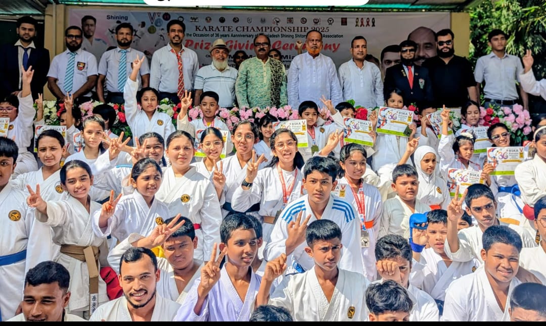 কুমিল্লার সাইনিং সিতোরিউ কারাতে এসোসিয়েশনের ৩৬ বছর উপলক্ষে অনুষ্ঠিত কারাতে প্রতিযোগিতা ও সাংস্কৃতিক অনুষ্ঠানে উপস্থিত অতিথিবৃন্দের সাথে কৃতি শিক্ষার্থীবৃন্দ।