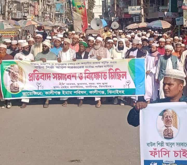 বাউল শিল্পী আবুল সরকারের সর্বোচ্চ শাস্তির দাবীতে ঝিনাইদহের কালীগঞ্জে প্রতিবাদ সমাবেশ ও বিক্ষোভ মিছিল হয়েছে। কালীগঞ্জ ইমাম পরিষদের আয়োজনে বাদ জুম্মা মিছিল সমাবেশ অনুষ্ঠিত হয়। সভাপতি মুফতি মাহমুদুল হাসানের সভাপতিত্বে মেইন বাসস্ট্যান্ডে সমাবেশে বক্তব্য রাখেন, মাওলানা আবু তালিব, মাওলানা রুহুল আমিন, হাফেজ হেদায়েত উল্লাহ, মাওলানা মাহফুজ রহমান, মাওলানা শাহীনুর রহমান, হাফেজ শাহজালাল প্রমুখ।
