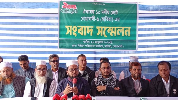 মাহিদুল ইসলাম হিমেল হাতিয়া (নোয়াখালী) প্রতিনিধি নোয়াখালী-৬ (হাতিয়া) সংসদীয় আসনে আসন্ন ত্রয়োদশ জাতীয় সংসদ নির্বাচনকে সামনে রেখে ঐক্যবদ্ধ ১০ দলীয় জোটের উদ্যোগে একটি সংবাদ সম্মেলন অনুষ্ঠিত হয়েছে। মঙ্গলবার, ২০ জানুয়ারি