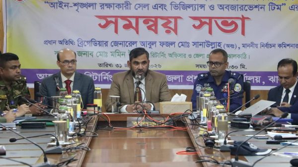 মিজানুর রহমান মুবিন, ঝালকাঠি জেলা প্রতিনিধি: ত্রয়োদশ জাতীয় সংসদ নির্বাচন ও গণভোট–২০২৬ উপলক্ষে ঝালকাঠি জেলার আইন-শৃঙ্খলা পরিস্থিতি ও সার্বিক প্রস্তুতি পর্যালোচনায় আজ শুক্রবার (৩১ জানুয়ারি ২০২৬) ঝালকাঠি জেলা প্রশাসকের কার্যালয়ের