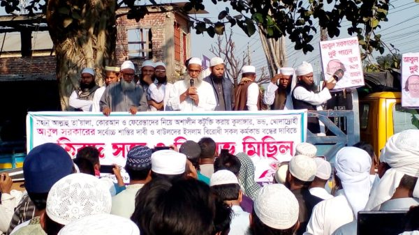 নিরঞ্জন মিত্র (নিরু) (ফরিদপুর জেলা প্রতিনিধিঃ ফরিদপুর সদর উপজেলার কানাইপুরে বাউল শিল্পী আবুল সরকার আল্লাহ তায়ালা সম্পর্কে ‘অবমাননাকর মন্তব্য’ করার অভিযোগে দৃষ্টান্তমূলক শাস্তি ও ফাঁসির দাবিতে বিক্ষোভ মিছিল ও প্রতিবাদ