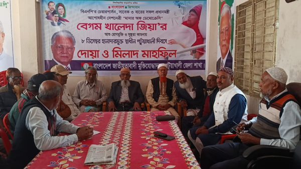 সাকিব হোসেন পটুয়াখালী জেলা প্রতিনিধিঃ- পটুয়াখালীর দুমকিতে বিএনপি চেয়ারপার্সন বেগম খালেদা জিয়ার রোগমুক্তি কামনায় দোয়া ও মিলাদ মাহফিল অনুষ্ঠিত হয়েছে। গতকাল সকালে উপজেলার লেবুখালী ইউনিয়ন বিএনপির পার্টি অফিসে পায়রা পয়েন্ট