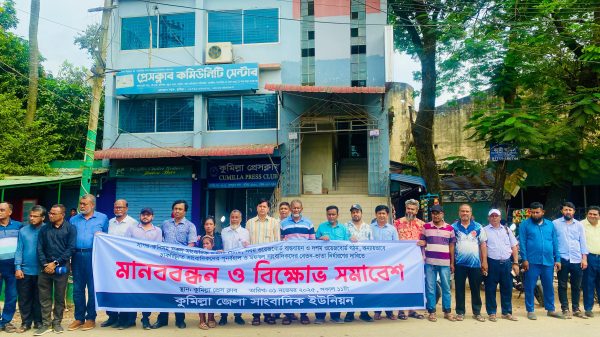 স্টাফ রিপোর্টার সাংবাদিক দম্পতি সাগর সরোয়ার ও মেহেরুন রুনিসহ সকল সাংবাদিক হত্যার বিচার, নবম ওয়েজবোর্ড বাস্তবায়ন ও দশম ওয়েজবোর্ড গঠনসহ ২১ দফা দাবিতে কুমিল্লায় মানববন্ধন ও বিক্ষোভ সমাবেশ অনুষ্ঠিত হয়েছে।