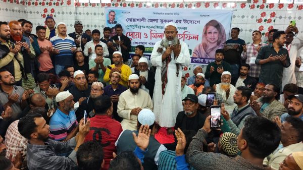 সাইফুল ইসলাম নোয়াখালী প্রতিনিধি নোয়াখালীতে সাবেক প্রধানমন্ত্রী ও বিএনপি চেয়ারপারসন বেগম খালেদা জিয়ার সুস্থতা, দীর্ঘায়ু কামনায় দোয়া মাহফিল ও দুস্থদের মাঝে খাবার বিতরণ অনুষ্ঠিত হয়েছে। সোমবার বিকেলে উপজলার চৌমুহনীর সুগন্ধা