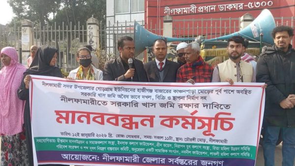 আব্দুস সালাম,নীলফামারী প্রতিনিধিঃ নীলফামারী সদর উপজেলার গোড়গ্রাম ইউনিয়নের হাজীগঞ্জ বাজারে সরকারি খাস জমি অবৈধভাবে দখল, বিক্রি ও অনুমোদনবিহীন স্থাপনা নির্মাণের বিরুদ্ধে ঘণ্টাব্যাপী চৌরঙ্গী মোড়ে মানববন্ধন ও গণস্বাক্ষর কর্মসূচি পালন করেছে