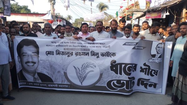 আবু কাওসার মাখন রাজশাহী ব্যুরো রাজশাহী সদর-২ আসনে ধানের শীষ প্রতীকের প্রার্থী মিজানুর রহমান মিনুর পক্ষে বিশাল প্রচার মিছিল অনুষ্ঠিত হয়েছে। শনিবার সকাল ১১টায় কাশিয়াডাংগা থানার অন্তর্ভুক্ত নগরপাড়া নির্বাচনী বিএনপি