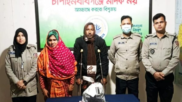 মাহিদুল ইসলাম ফরহাদ চাঁপাইনবাবগঞ্জ জেলা প্রতিনিধি চাঁপাইনবাবগঞ্জের নাচোল উপজেলায় মাদকদ্রব্য নিয়ন্ত্রণ অধিদপ্তরের অভিযানে স্বামী-স্ত্রীসহ দুইজনকে আটক করা হয়েছে। এসময় তাদের কাছ থেকে ১ কেজি গাঁজা উদ্ধার করা হয়। মাদকদ্রব্য নিয়ন্ত্রণ