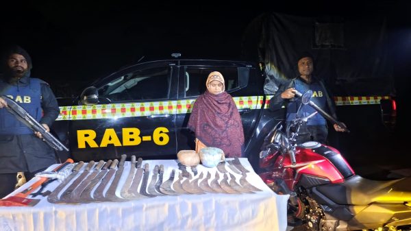 মোঃ রবিউল ইসলাম, স্টাফ রিপোর্টার ঝিনাইদহঃ ঝিনাইদহের হরিণাকুণ্ডু উপজেলার পৌরসভার চটকাবাড়িয়া এলাকায় র্যাবের-৬ অভিযানে ১জন দুষ্কৃতকারীকে আটক করা হয়েছে। এসময় তাদের কাছ থেকে নগদ টাকা, কুড়াল, দা, বটি, ছুরিসহ ১